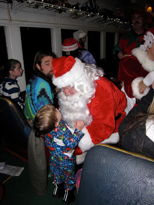 We drove through the wind and the rain to go take a ride on the polar express! On Friday, Grey and Andrew took Michelle, Gma (Andrew's Grandma), Grammie, and me to Willits to catch the Polar Express train (aka Skunk Train). The elves helped us board the train, a musician sang with us, they treated us to hot chocolate and cookies...and after about 45 minutes we made a fast stop at the north pole to pick up Santa! Santa and Mrs. Claus came aboard and rode back with us to the train station, stopping and visiting with each of the little kids(and big kids too!). It was so much fun and I can't wait to do it again next year!