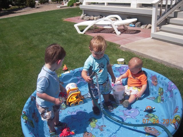 The boys had fun playing in the pool at Jared's Grandma's house and loved showing us their belly buttons (Andrew liked to help Jared find his!)...